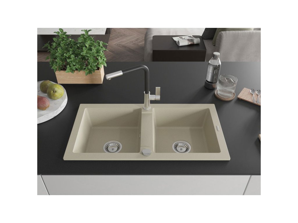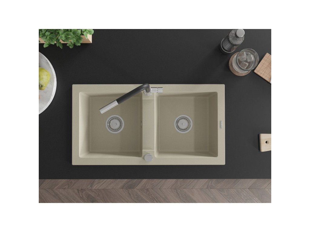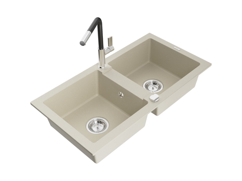 Granitový drez Mexen Mario s 2 misami a kuchynskou batériou Flora, béžová - 6504-69-670401-07