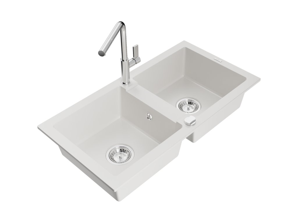 Granitový drez Mexen Mario s 2 misami a kuchynskou batériou Flora, biely - 6504-20-670401-00