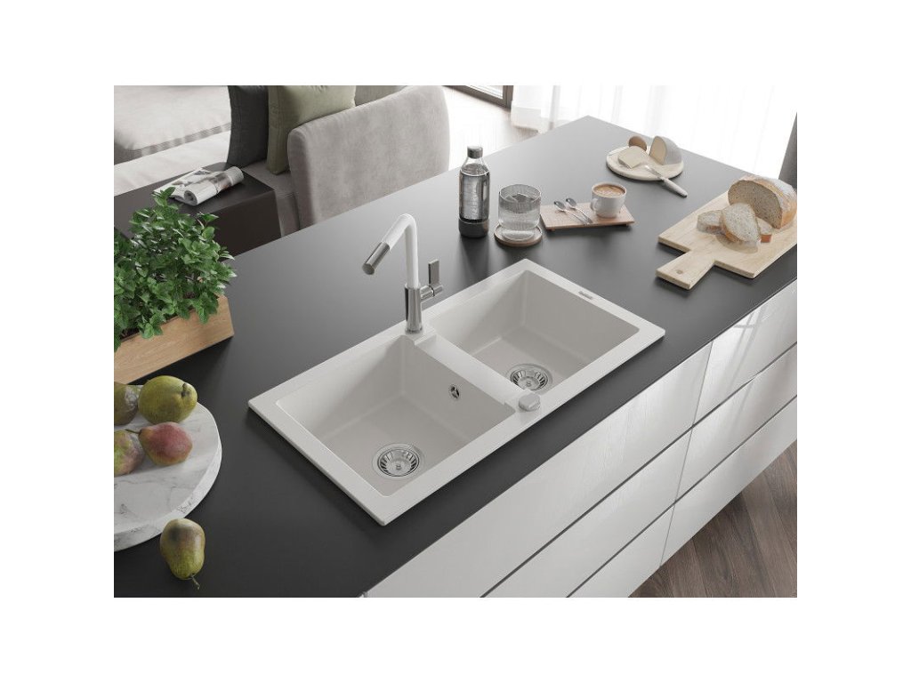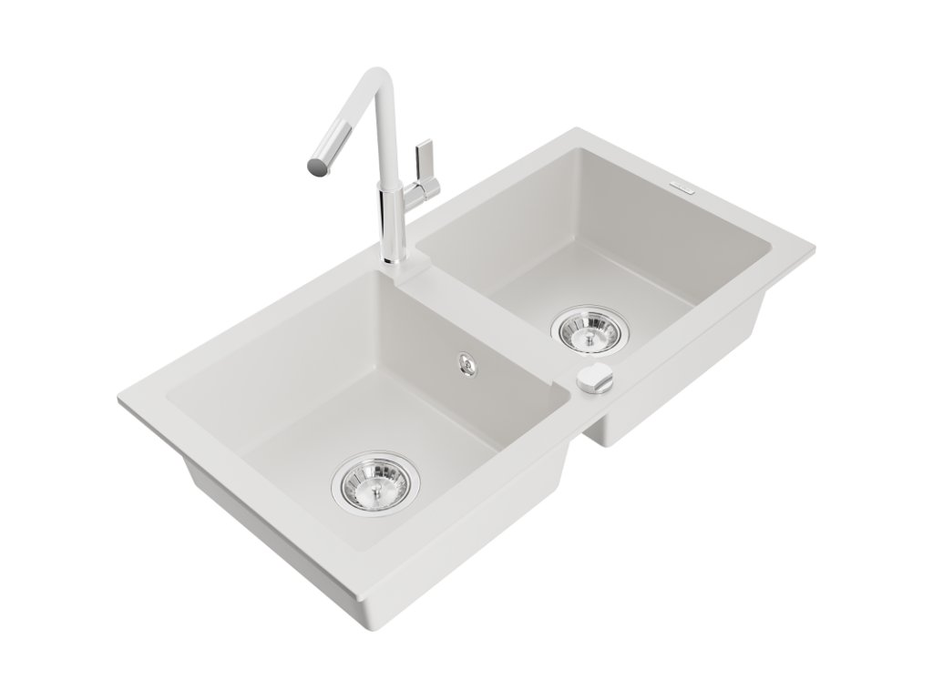 Granitový drez Mexen Mario s 2 misami a kuchynskou batériou Flora, biely - 6504-20-670401-02