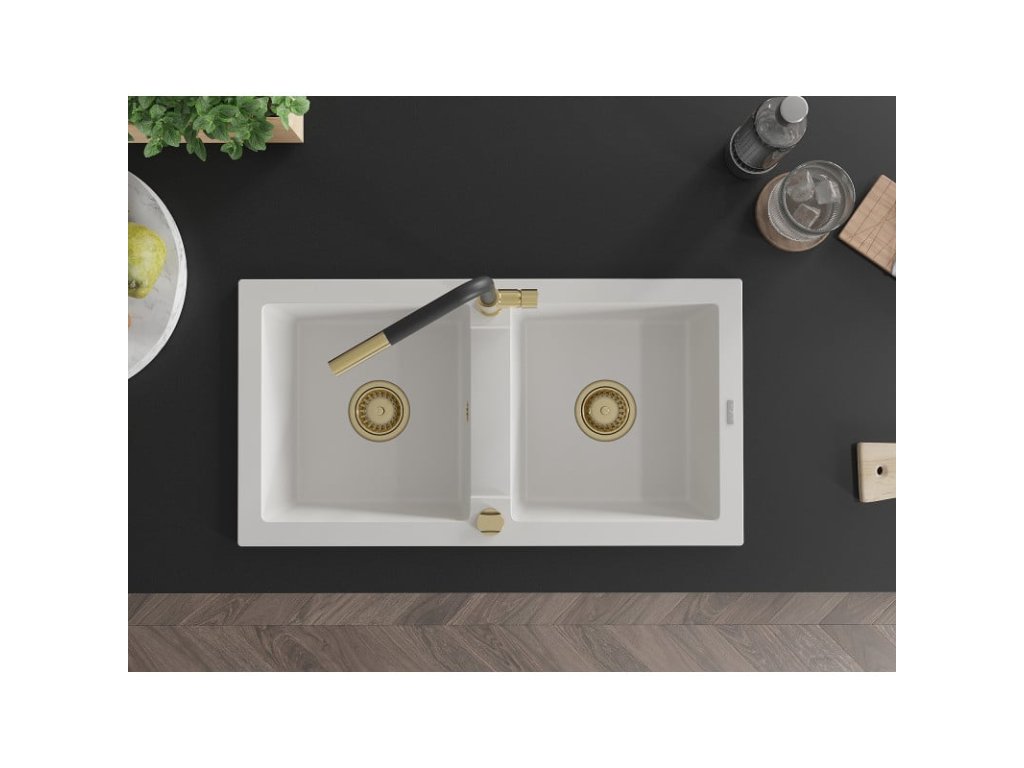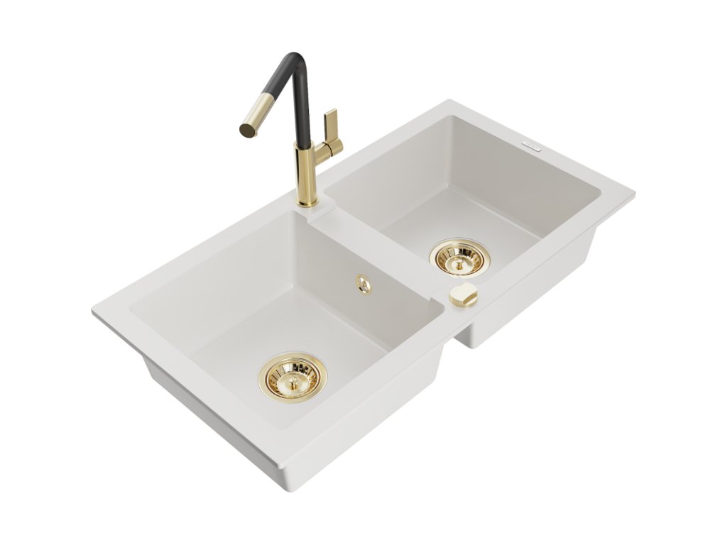Granitový drez Mexen Mario s 2 misami a kuchynskou batériou Flora, biely - 6504-20-670401-57-G