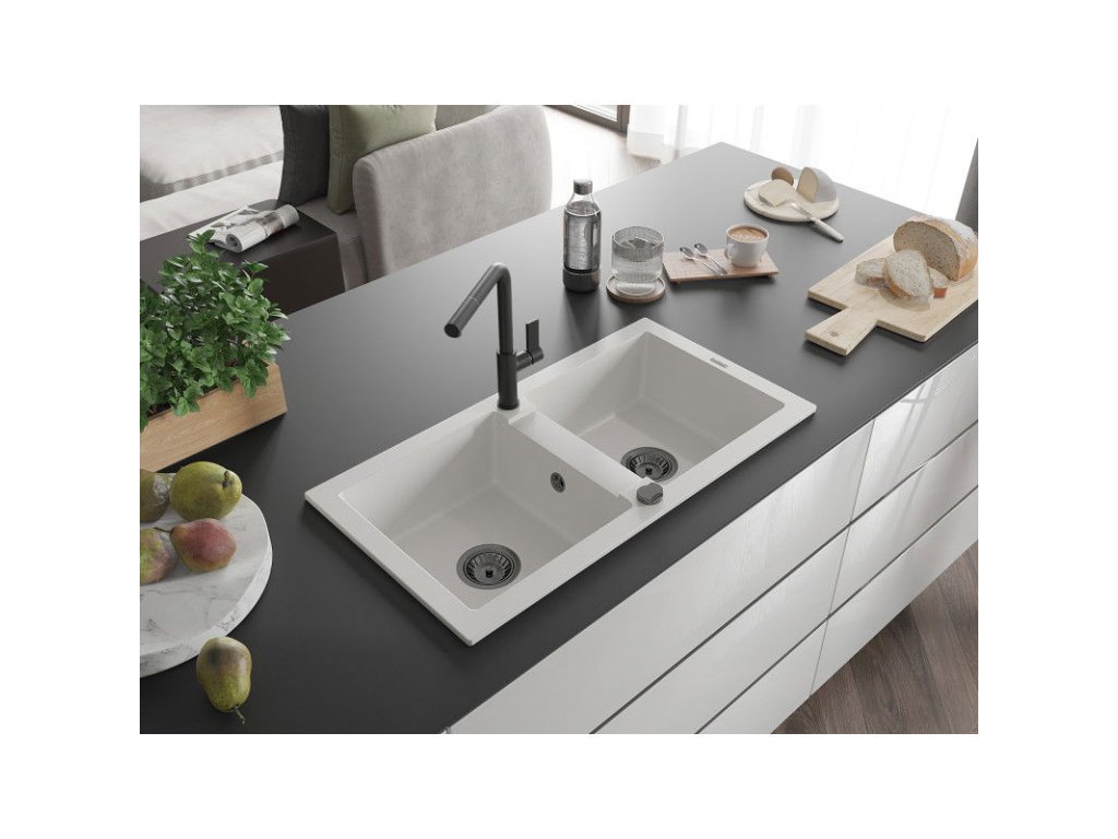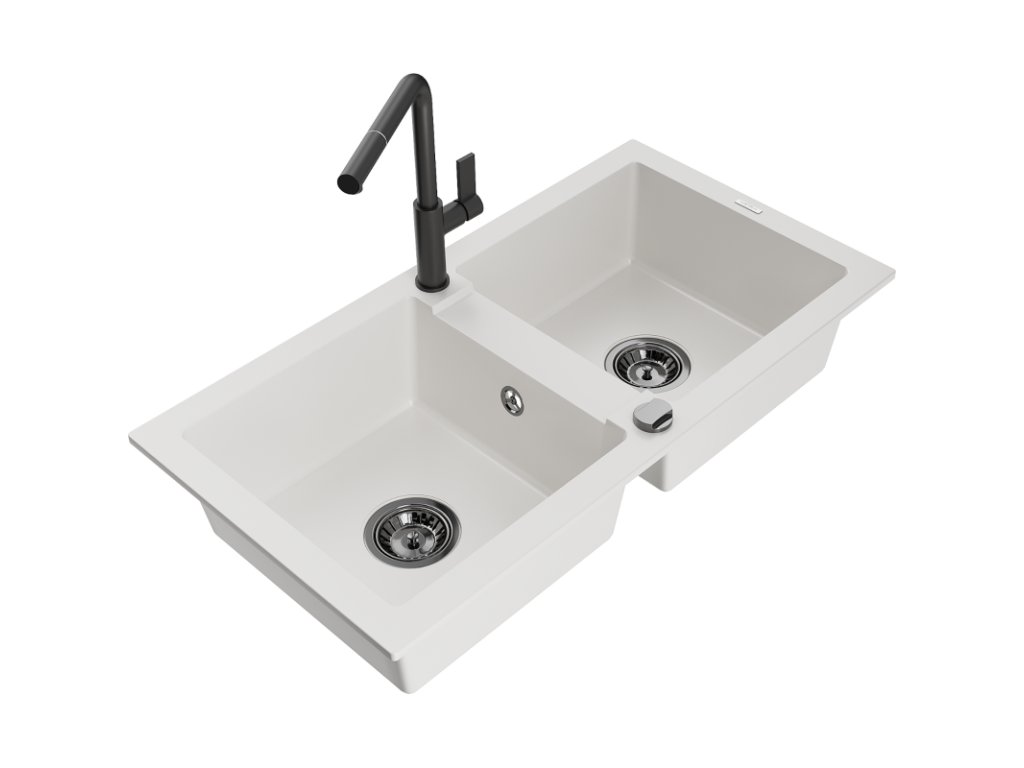 Granitový drez Mexen Mario s 2 misami a kuchynskou batériou Flora, biely - 6504-20-670401-70-B