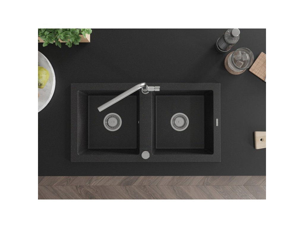 Granitový drez Mexen Mario s 2 misami a kuchynskou batériou Flora, čierna/strieborná metalíza - 6504-73-670401-00