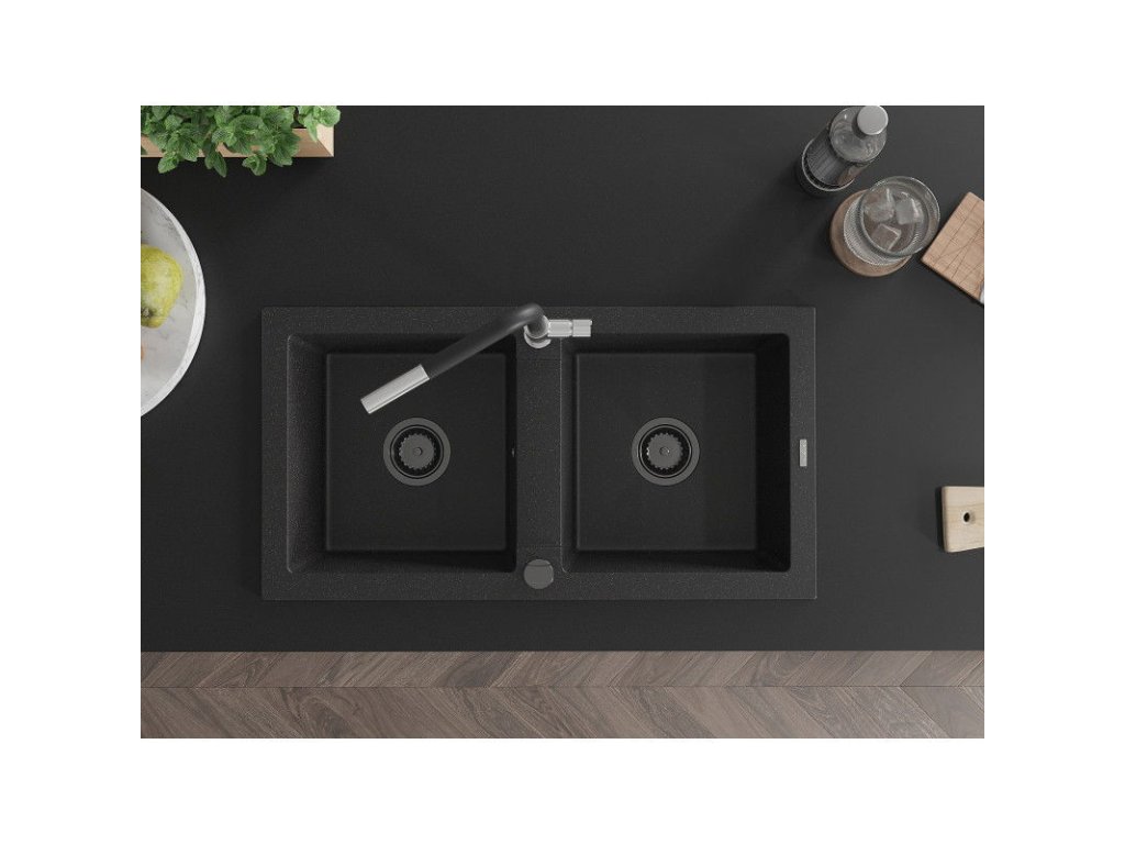 Granitový drez Mexen Mario s 2 misami a kuchynskou batériou Flora, čierna/strieborná metalíza - 6504-73-670401-07-B