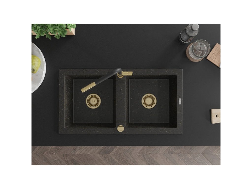 Granitový drez Mexen Mario s 2 misami a kuchynskou batériou Flora, čierna/zlatá metalíza - 6504-75-670401-57-G