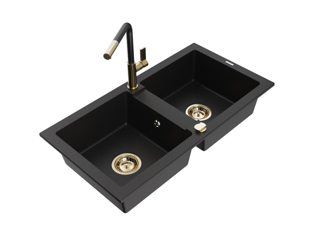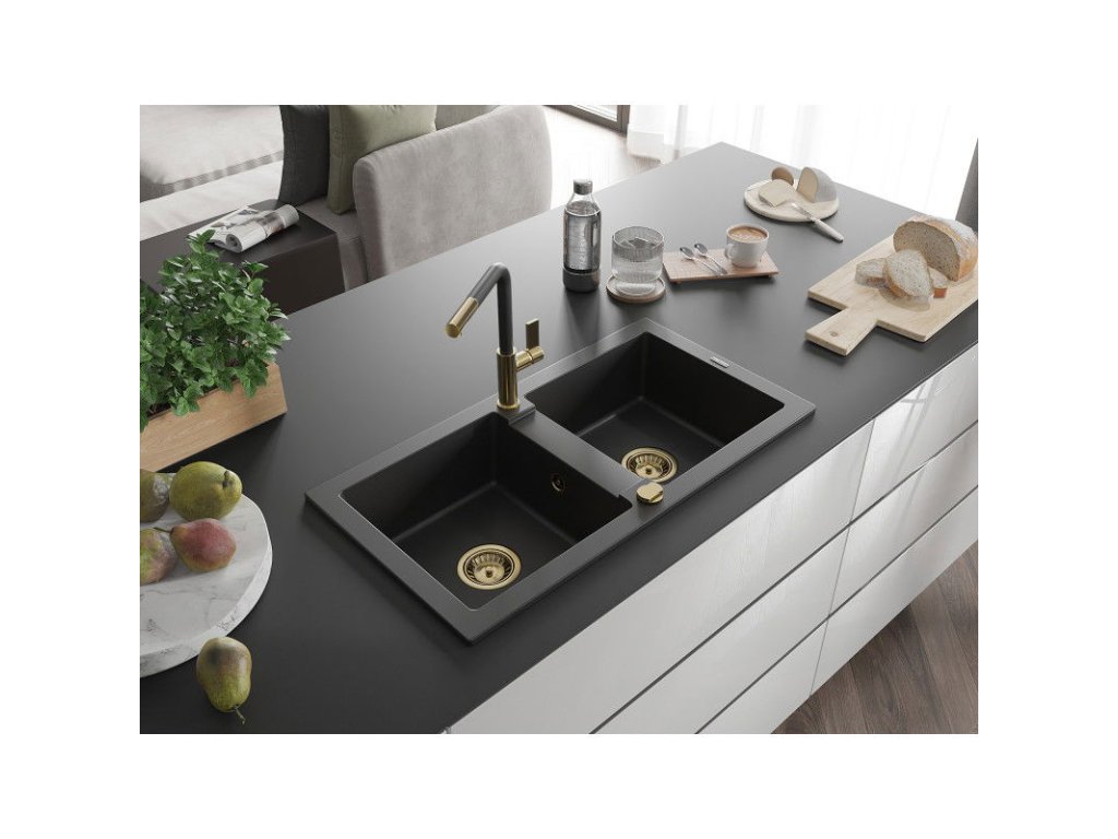 Granitový drez Mexen Mario s 2 misami a kuchynskou batériou Flora, čierny - 6504-77-670401-57-G