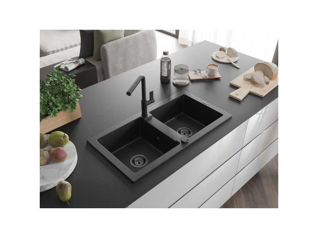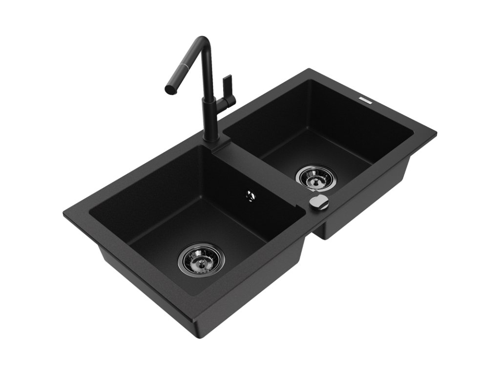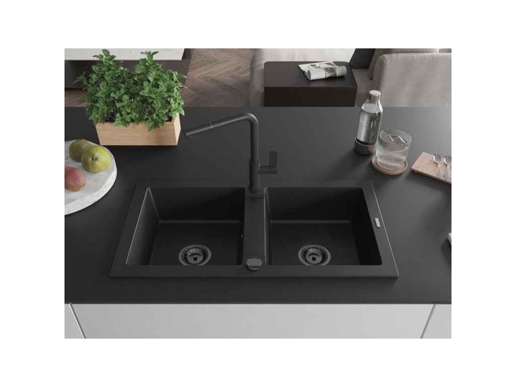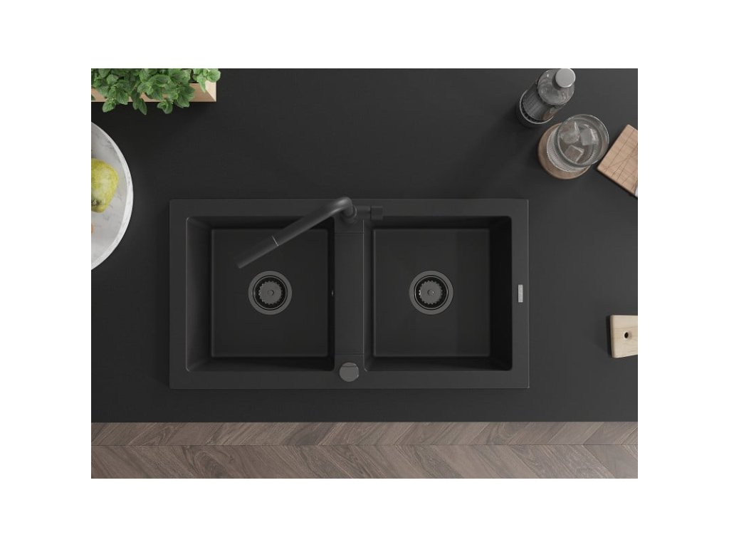 Granitový drez Mexen Mario s 2 misami a kuchynskou batériou Flora, čierny - 6504-77-670401-70-B
