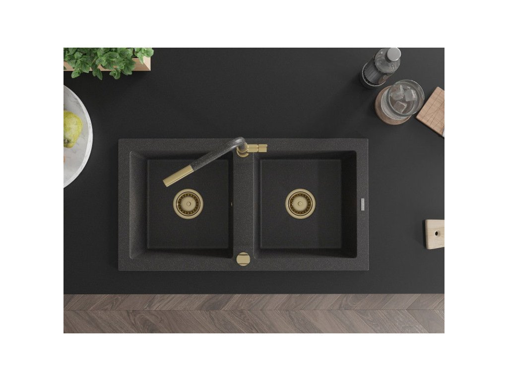 Granitový drez Mexen Mario s 2 misami a kuchynskou batériou Flora, škvrnitá čierna - 6504-76-670401-75-G