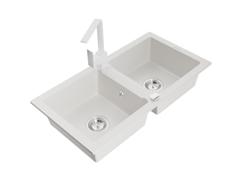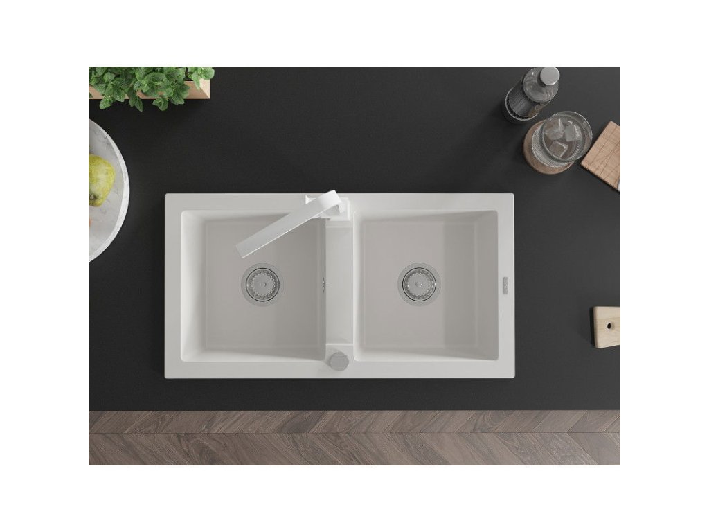 Granitový drez Mexen Mario s 2 misami a kuchynskou batériou Rita, biely - 6504-20-670300-20