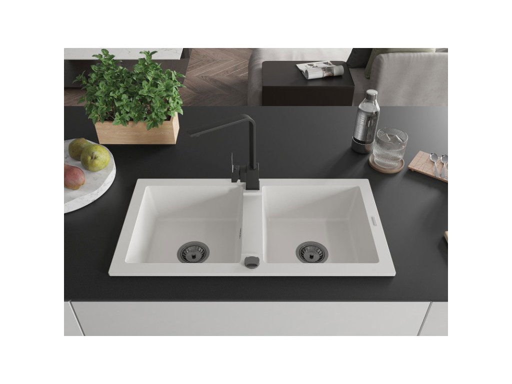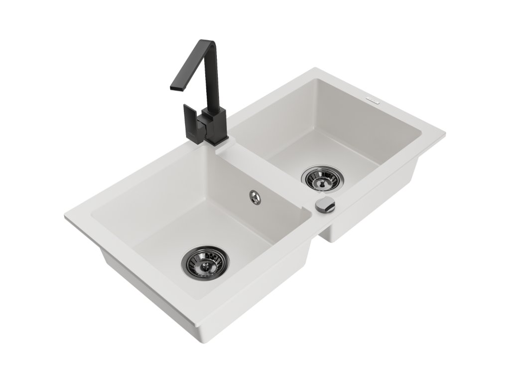 Granitový drez Mexen Mario s 2 misami a kuchynskou batériou Rita, biely - 6504-20-670300-70
