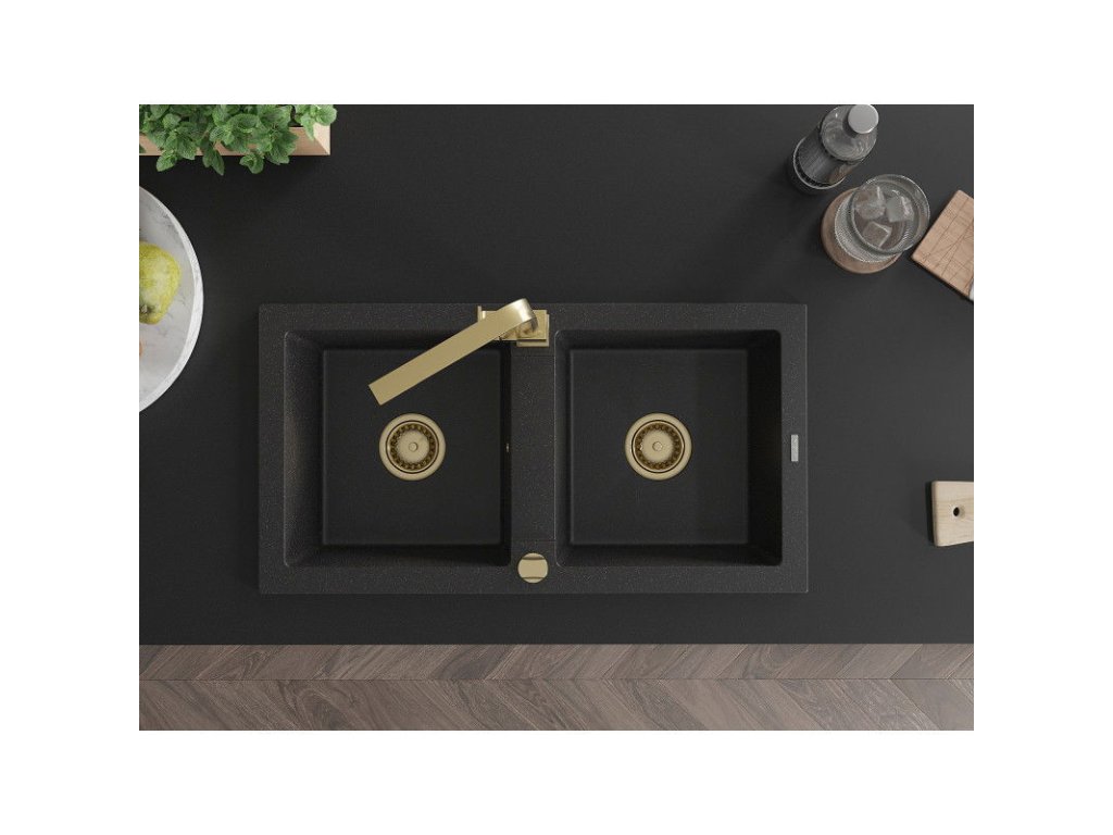 Granitový drez Mexen Mario s 2 misami a kuchynskou batériou Rita, čierna/strieborná metalíza - 6504-73-670300-50