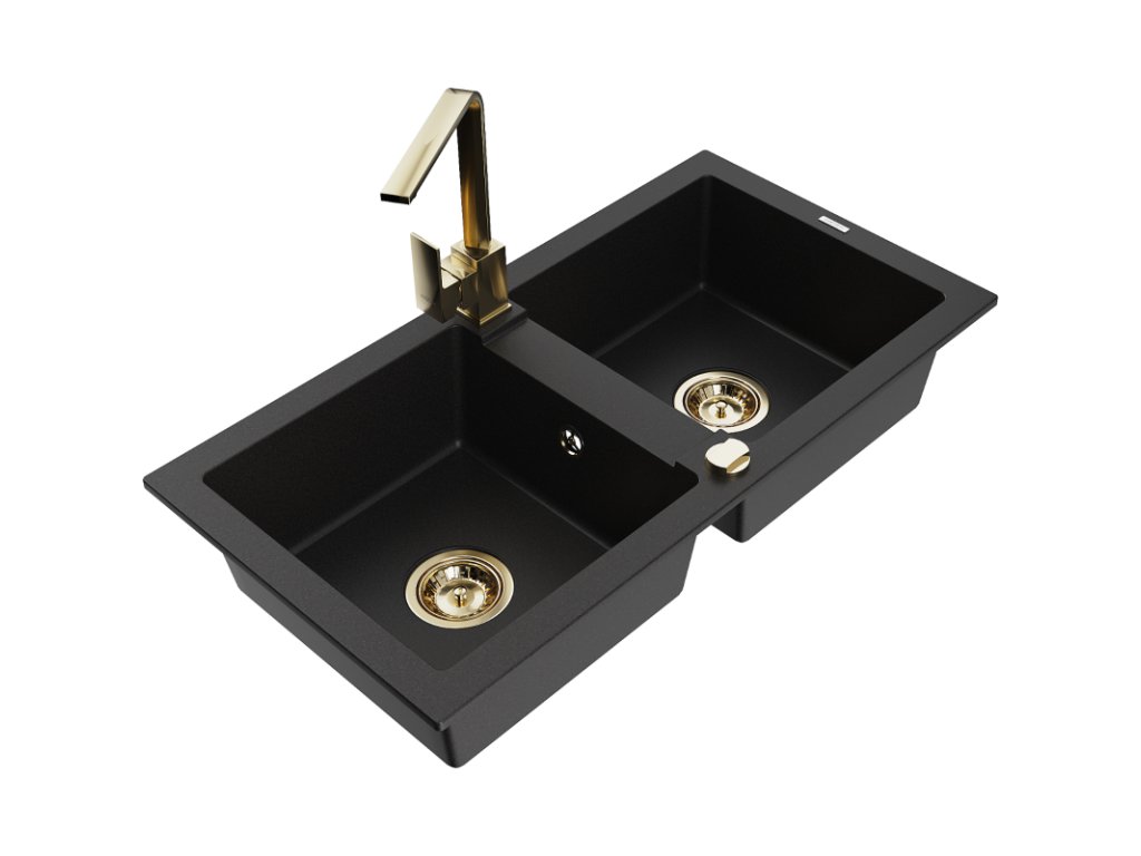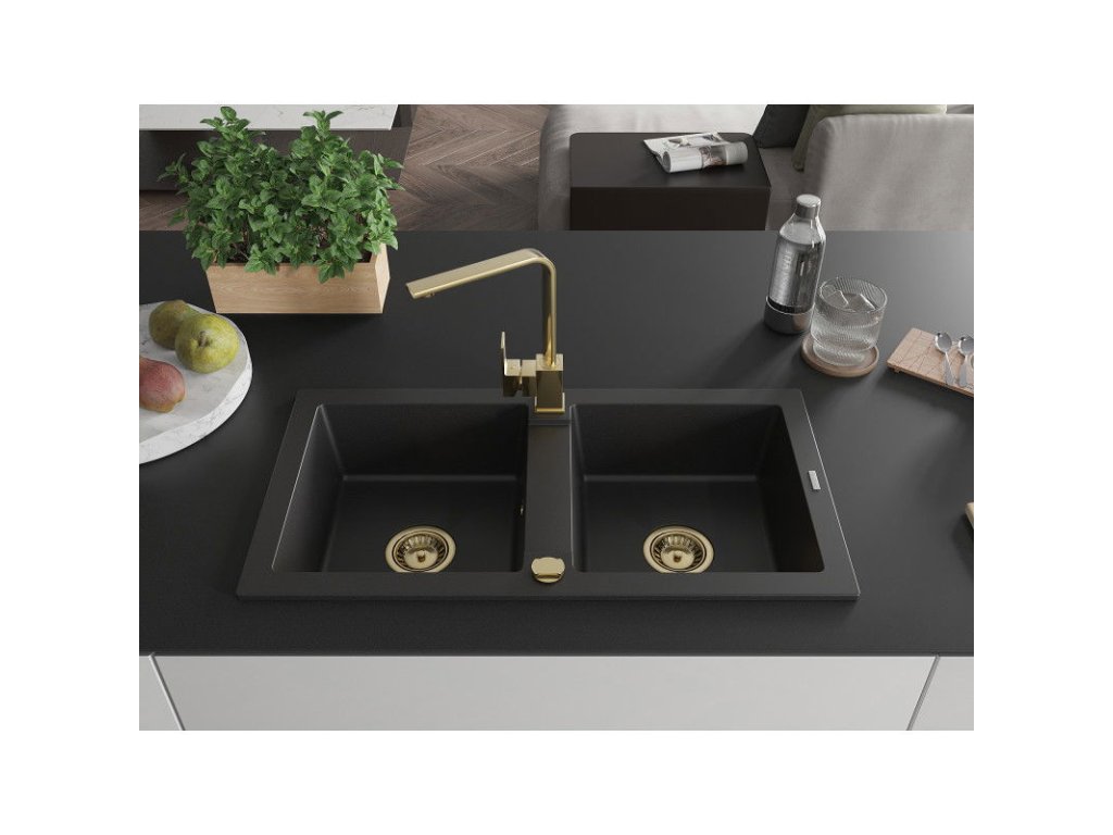 Granitový drez Mexen Mario s 2 misami a kuchynskou batériou Rita, čierny - 6504-77-670300-50