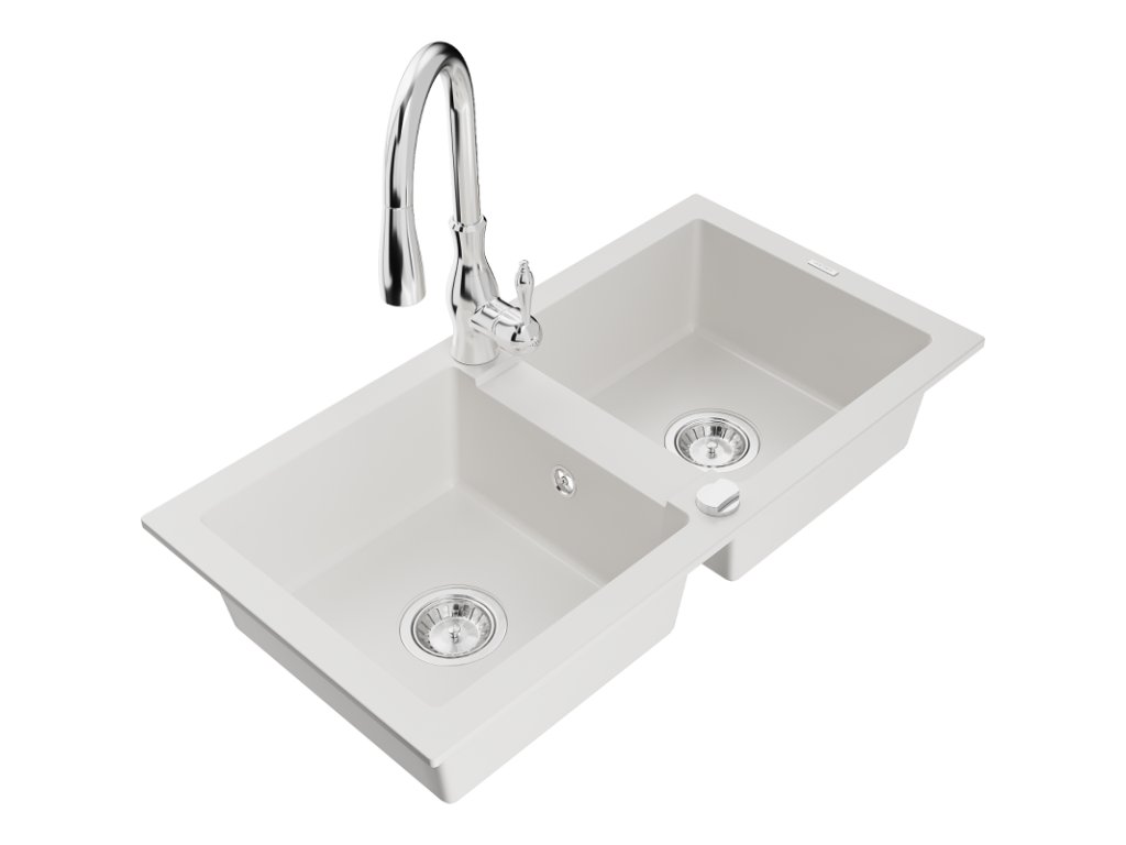 Granitový drez Mexen Mario s 2 misami a kuchynskou batériou Savita, biely - 6504-20-672601-00