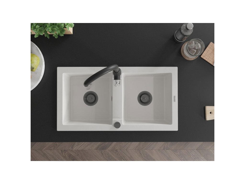 Granitový drez Mexen Mario s 2 misami a kuchynskou batériou Savita, biely - 6504-20-672601-70