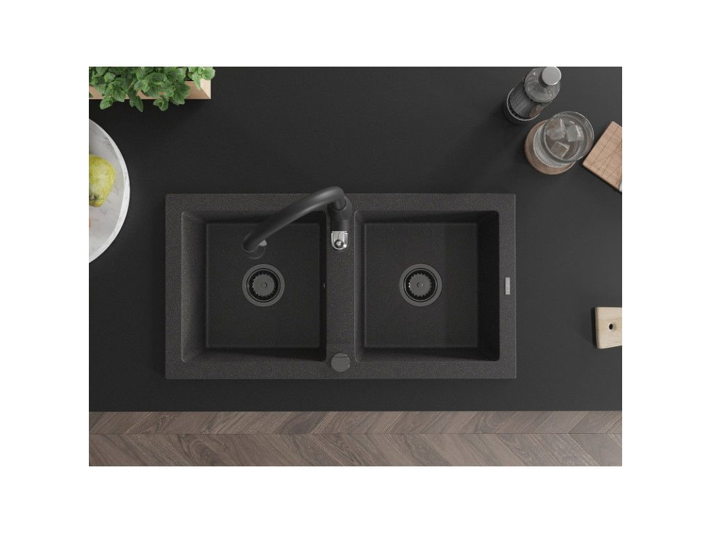 Granitový drez Mexen Mario s 2 misami a kuchynskou batériou Savita, čierna škvrnitá - 6504-76-672601-70-B