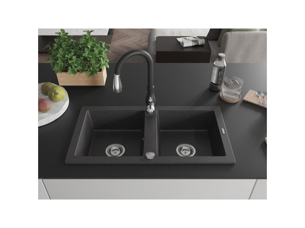 Granitový drez Mexen Mario s 2 misami a kuchynskou batériou Savita, čierna škvrnitá - 6504-76-672601-70