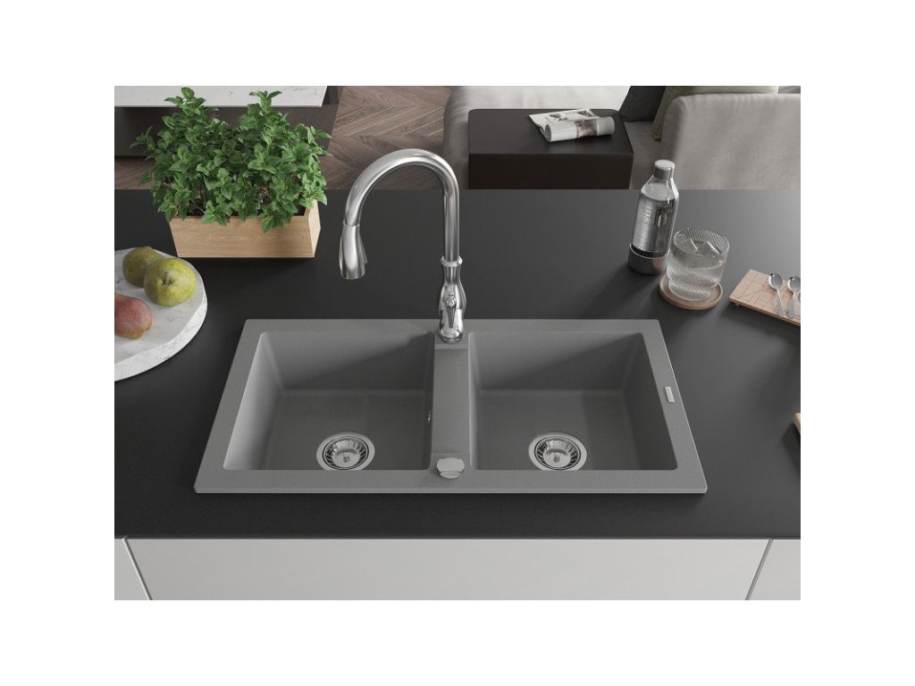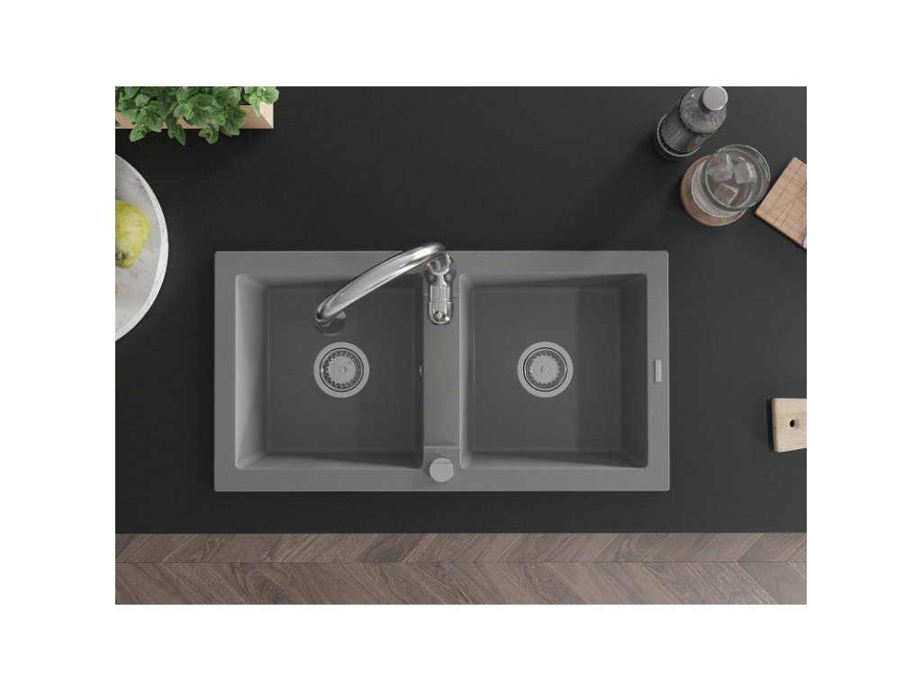 Granitový drez Mexen Mario s 2 misami a kuchynskou batériou Savita, sivý - 6504-71-672601-00