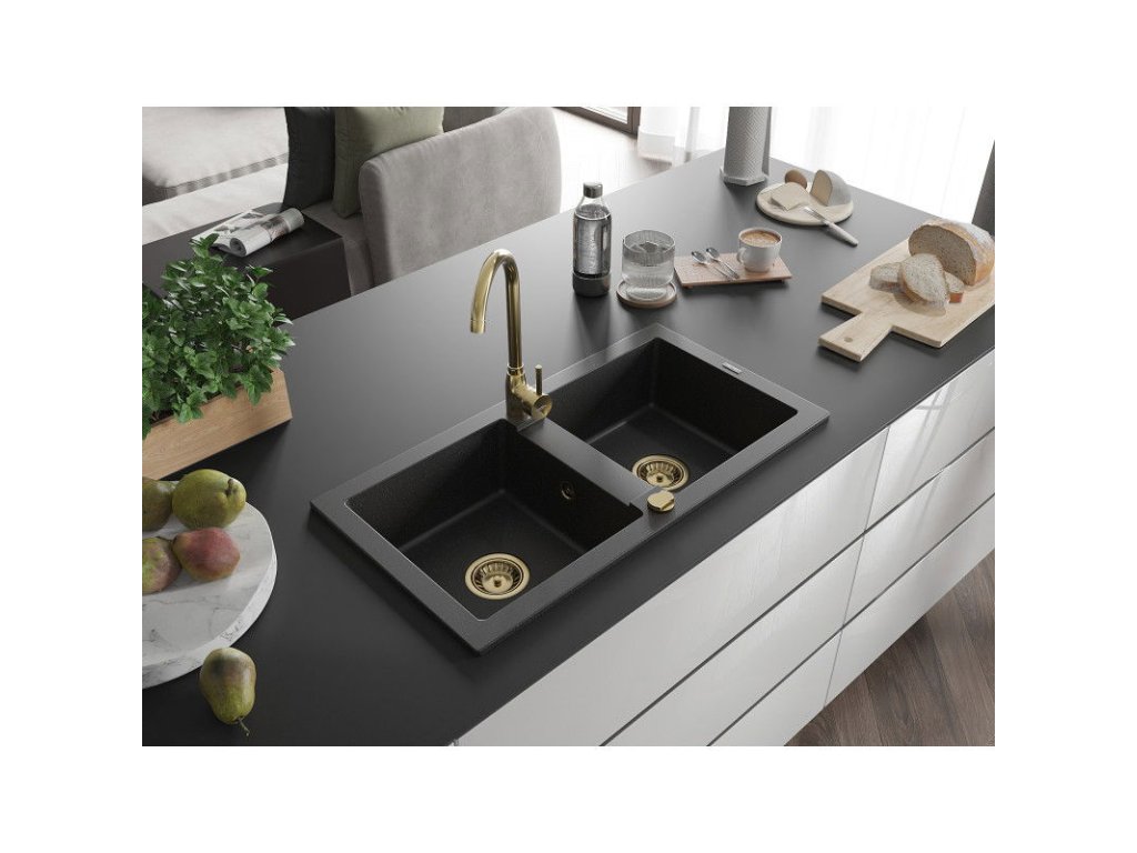 Granitový drez Mexen Mario s 2 misami a kuchynskou batériou Telma, čierna/strieborná - 6504-73-670200-50