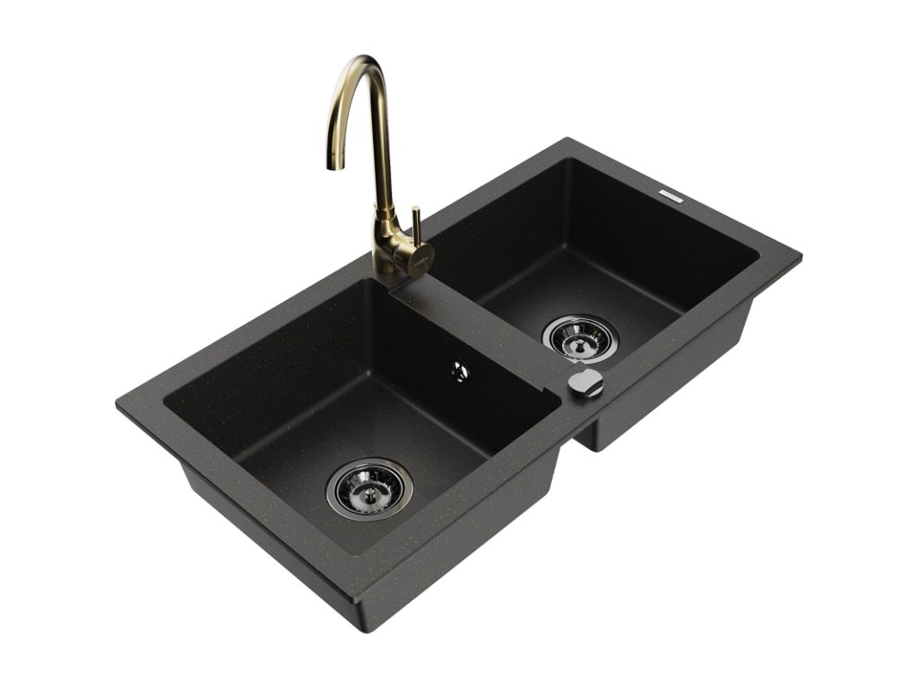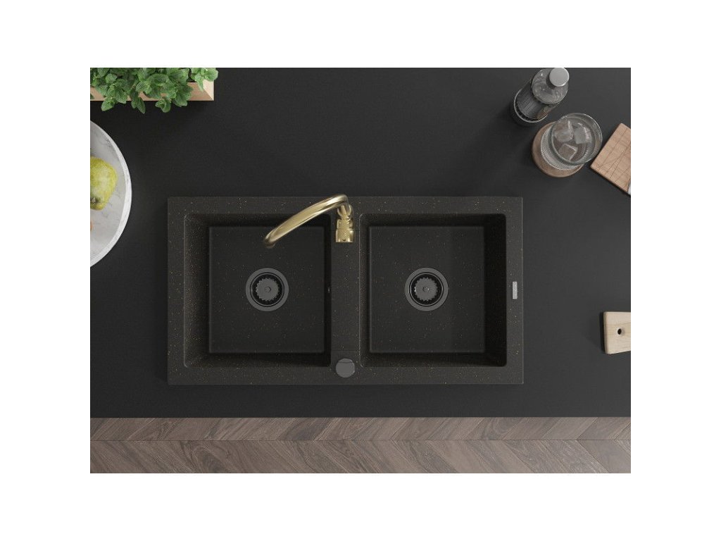 Granitový drez Mexen Mario s 2 misami a kuchynskou batériou Telma, čierna/zlatá - 6504-75-670200-50-B