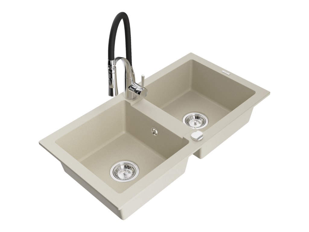 Granitový drez Mexen Mario s 2 miskami a kuchynskou batériou Aster, béžový - 6504-69-73450-07