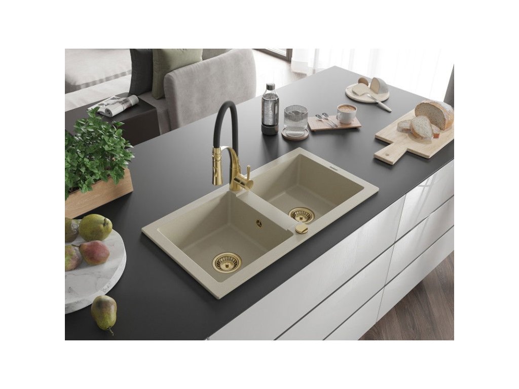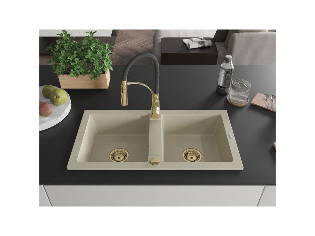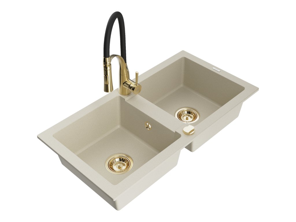 Granitový drez Mexen Mario s 2 miskami a kuchynskou batériou Aster, béžový - 6504-69-73450-57-G
