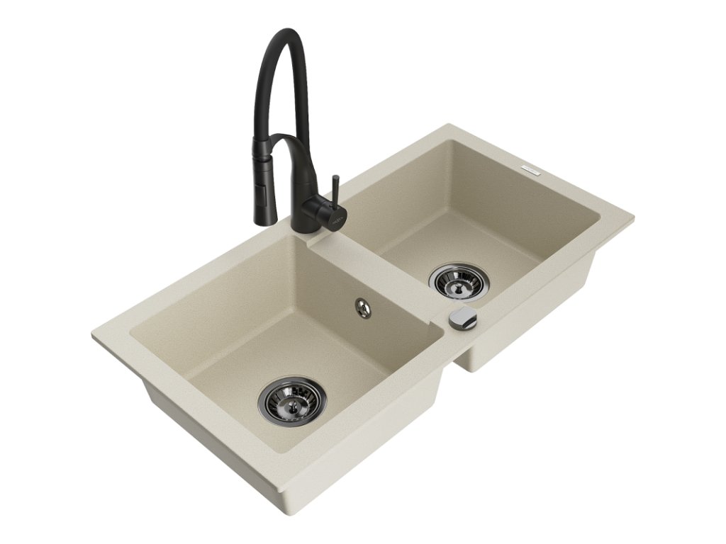 Granitový drez Mexen Mario s 2 miskami a kuchynskou batériou Aster, béžový - 6504-69-73450-70-B