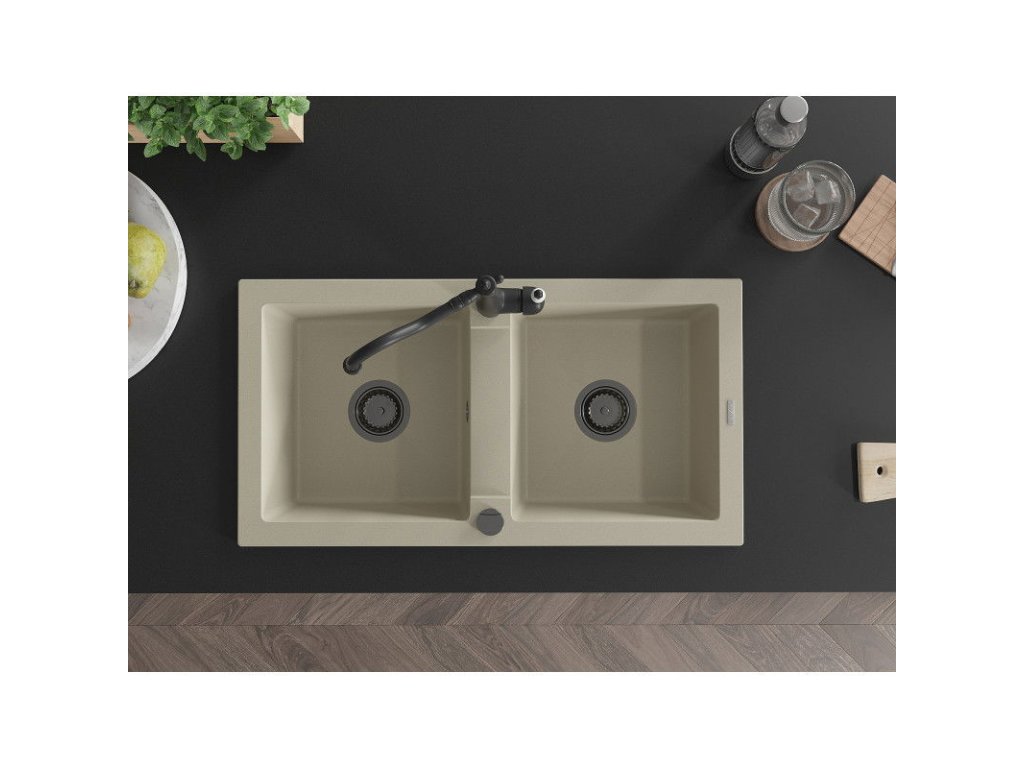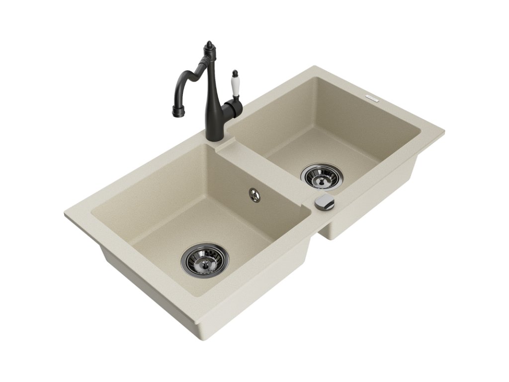 Granitový drez Mexen Mario s 2 miskami a kuchynskou batériou Carla, béžová - 6504-69-670700-70