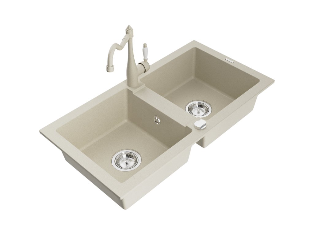 Granitový drez Mexen Mario s 2 miskami a kuchynskou batériou Carla, béžový - 6504-69-670700-69