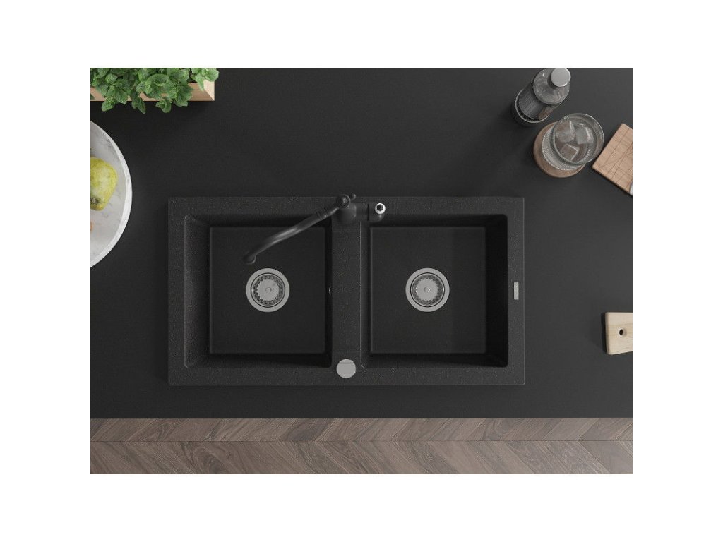Granitový drez Mexen Mario s 2 miskami a kuchynskou batériou Carla, čierna/strieborná metalíza - 6504-73-670700-70