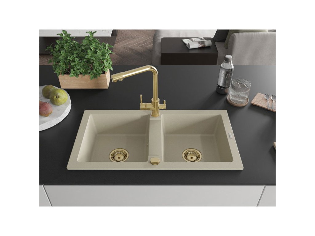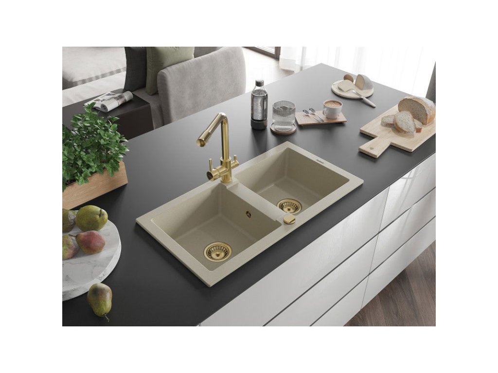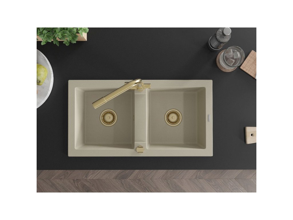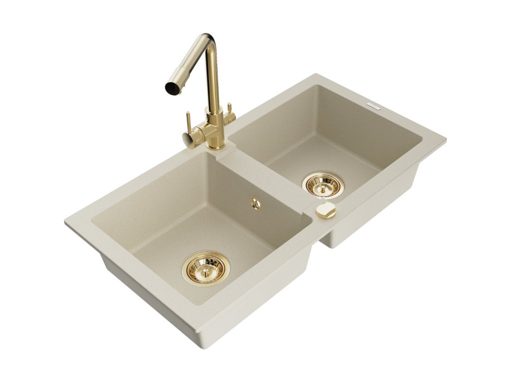 Granitový drez Mexen Mario s 2 miskami a kuchynskou batériou Duero, béžový - 6504-69-671600-50