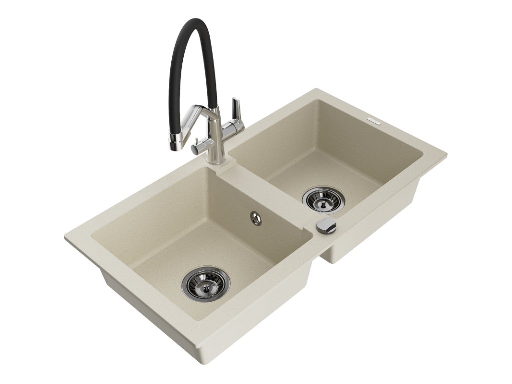 Granitový drez Mexen Mario s 2 miskami a kuchynskou batériou Duo, béžový - 6504-69-671701-07-B