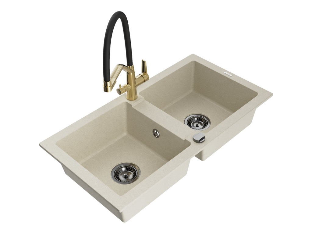 Granitový drez Mexen Mario s 2 miskami a kuchynskou batériou Duo, béžový - 6504-69-671701-57-B
