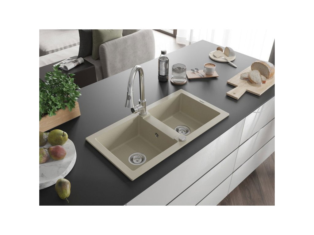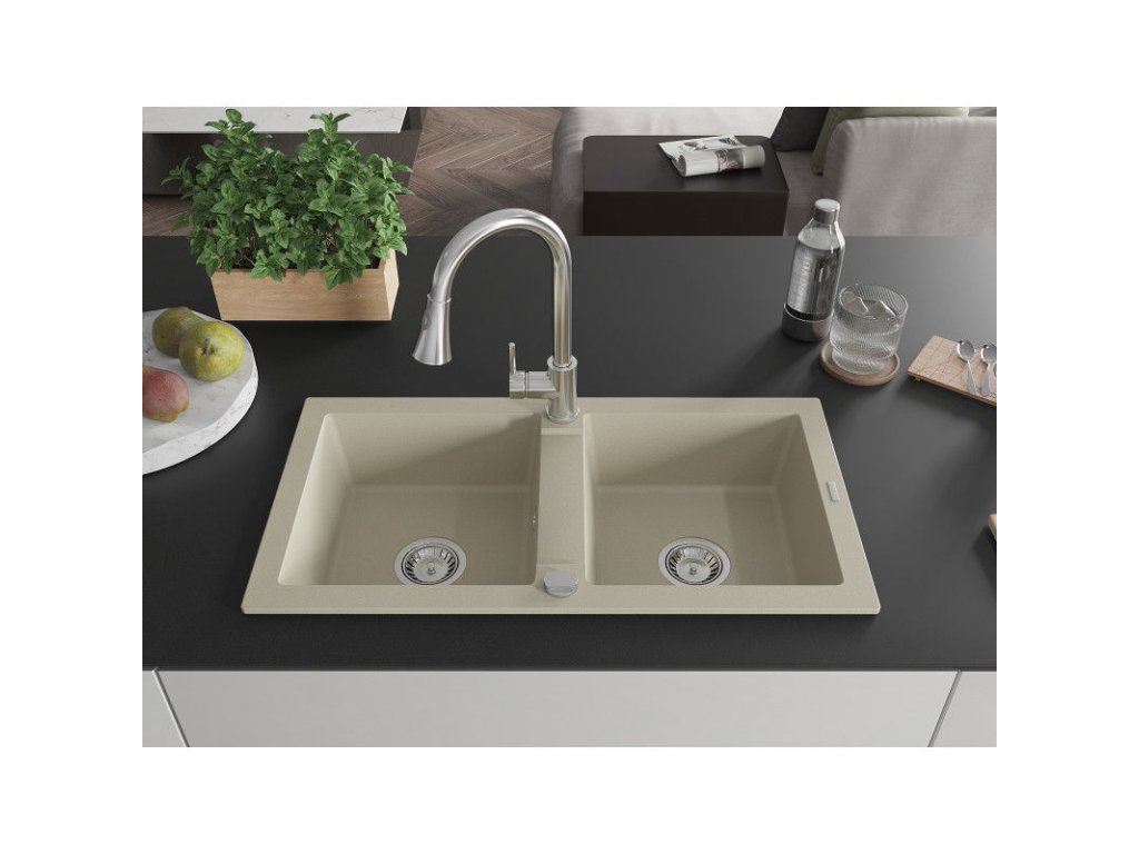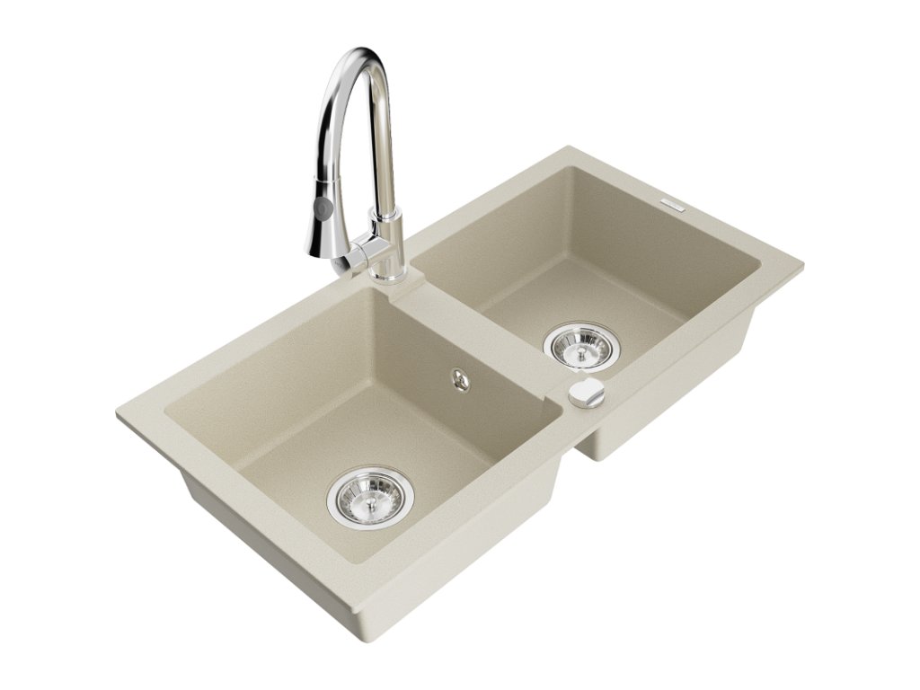 Granitový drez Mexen Mario s 2 miskami a kuchynskou batériou Elia, béžový - 6504-69-670101-00