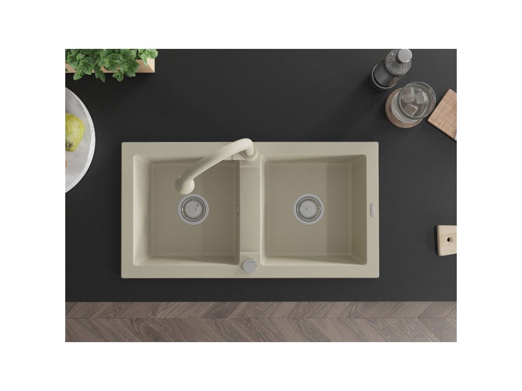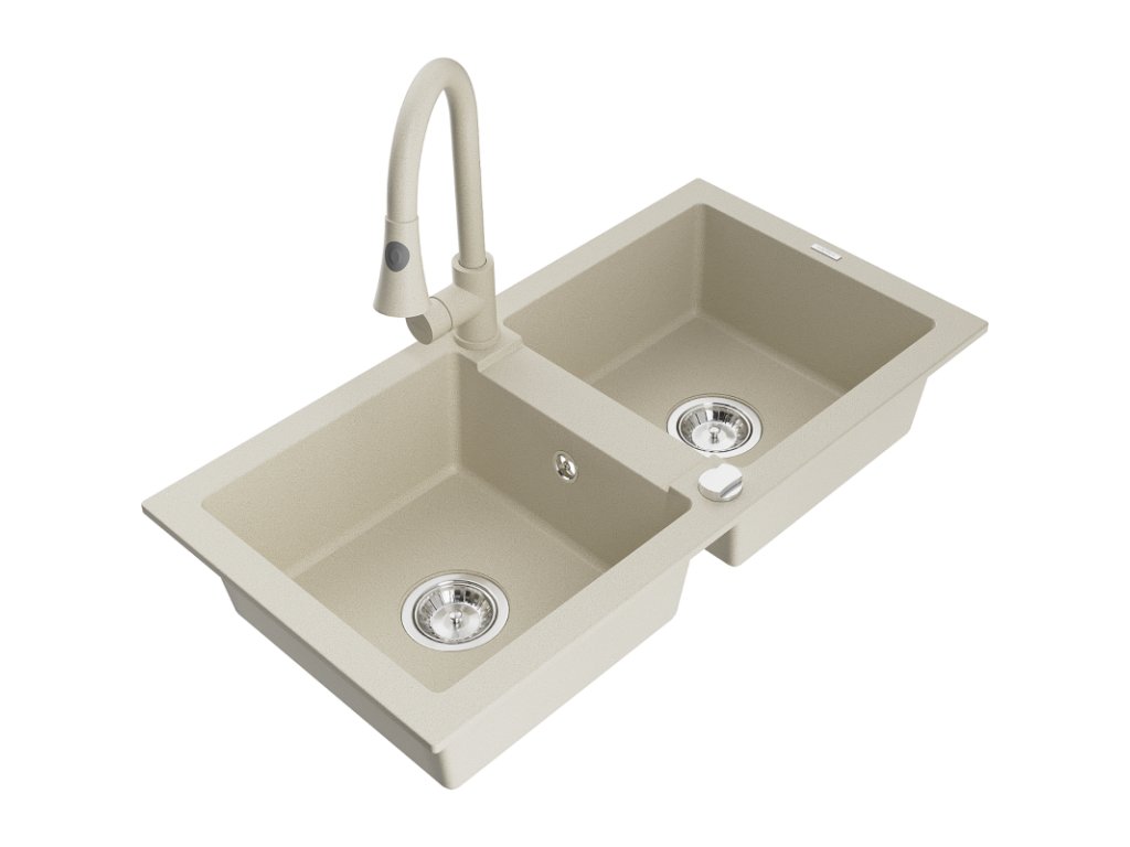 Granitový drez Mexen Mario s 2 miskami a kuchynskou batériou Elia, béžový - 6504-69-670101-69