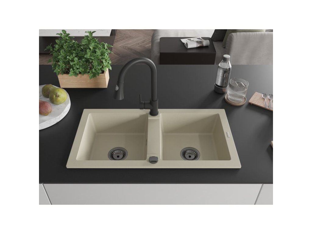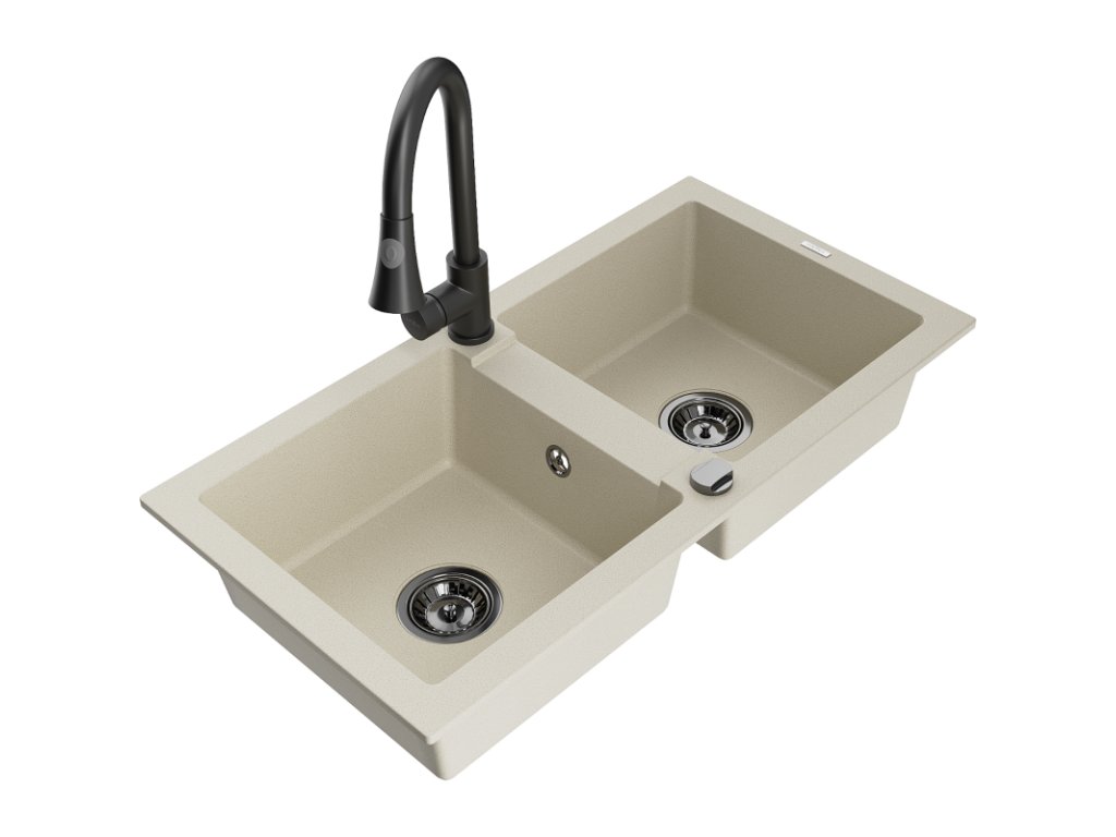 Granitový drez Mexen Mario s 2 miskami a kuchynskou batériou Elia, béžový - 6504-69-670101-70