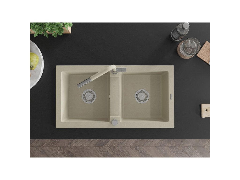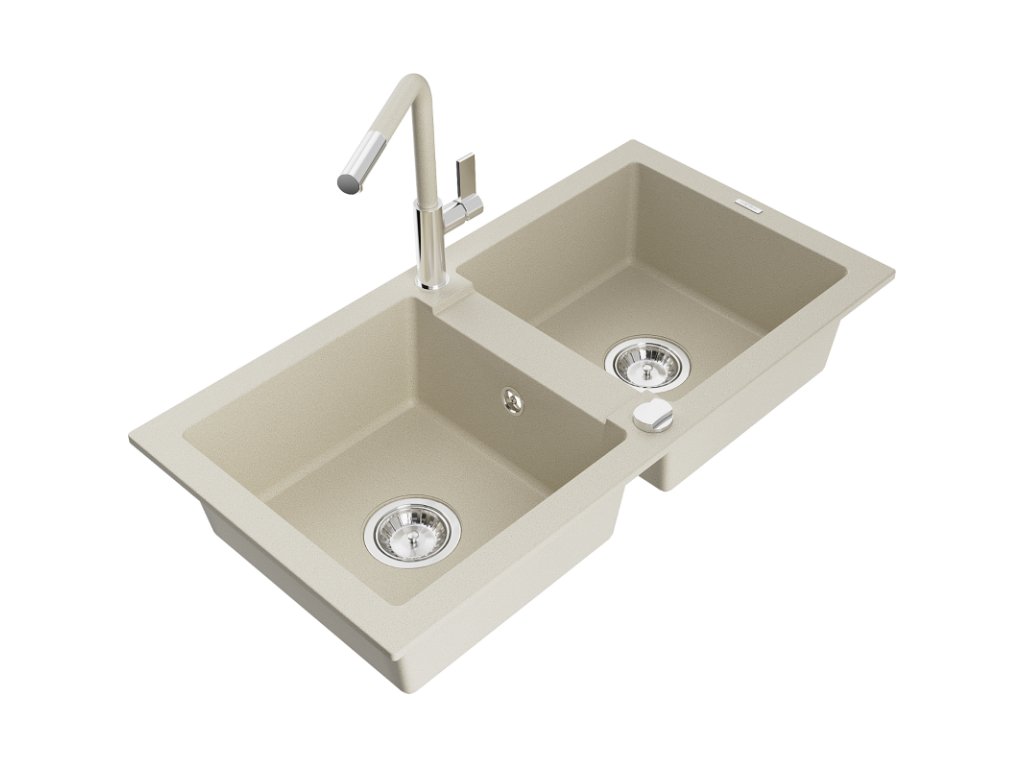 Granitový drez Mexen Mario s 2 miskami a kuchynskou batériou Flora, béžová - 6504-69-670401-09