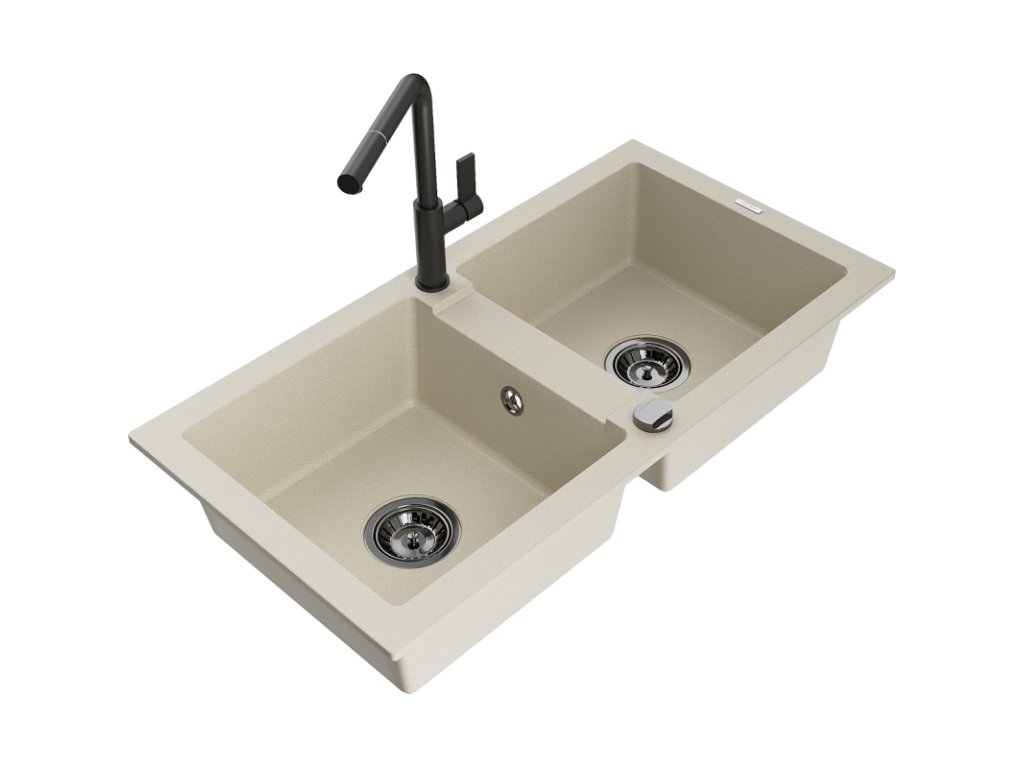 Granitový drez Mexen Mario s 2 miskami a kuchynskou batériou Flora, béžový - 6504-69-670401-70-B