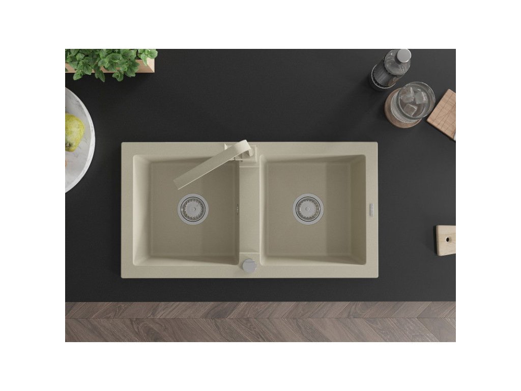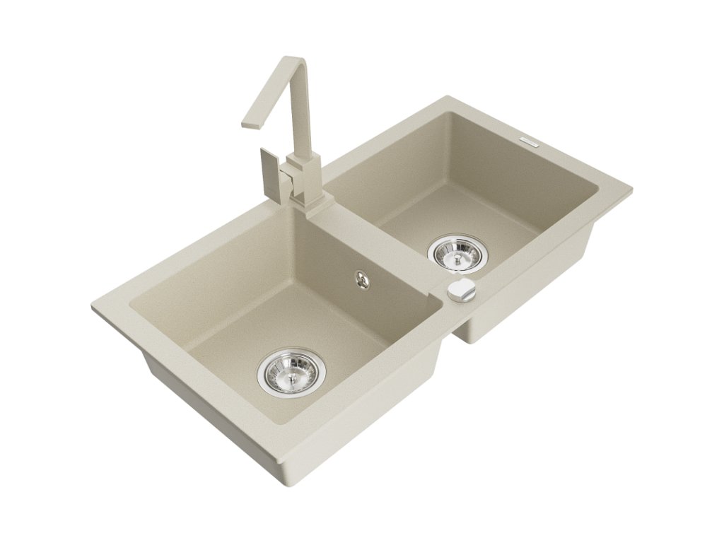 Granitový drez Mexen Mario s 2 miskami a kuchynskou batériou Rita, béžový - 6504-69-670300-69