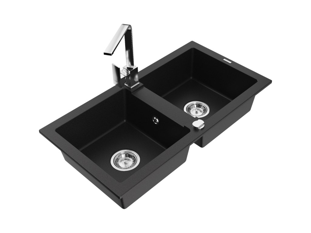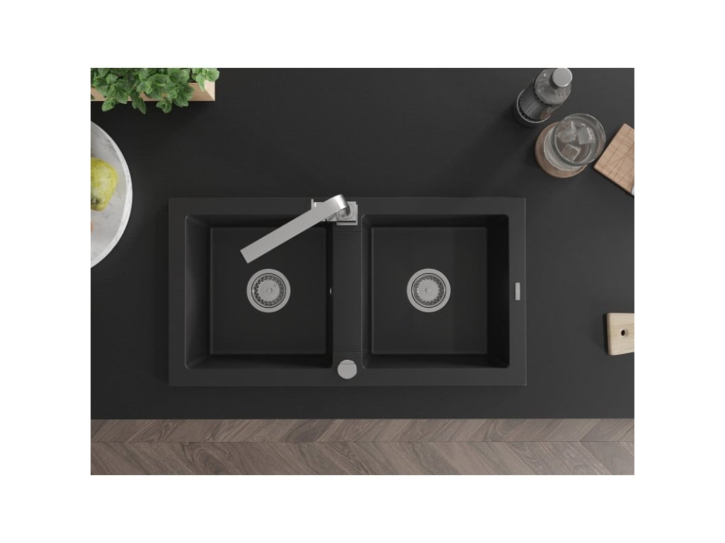 Granitový drez Mexen Mario s 2 miskami a kuchynskou batériou Rita, čierny - 6504-77-670300-00