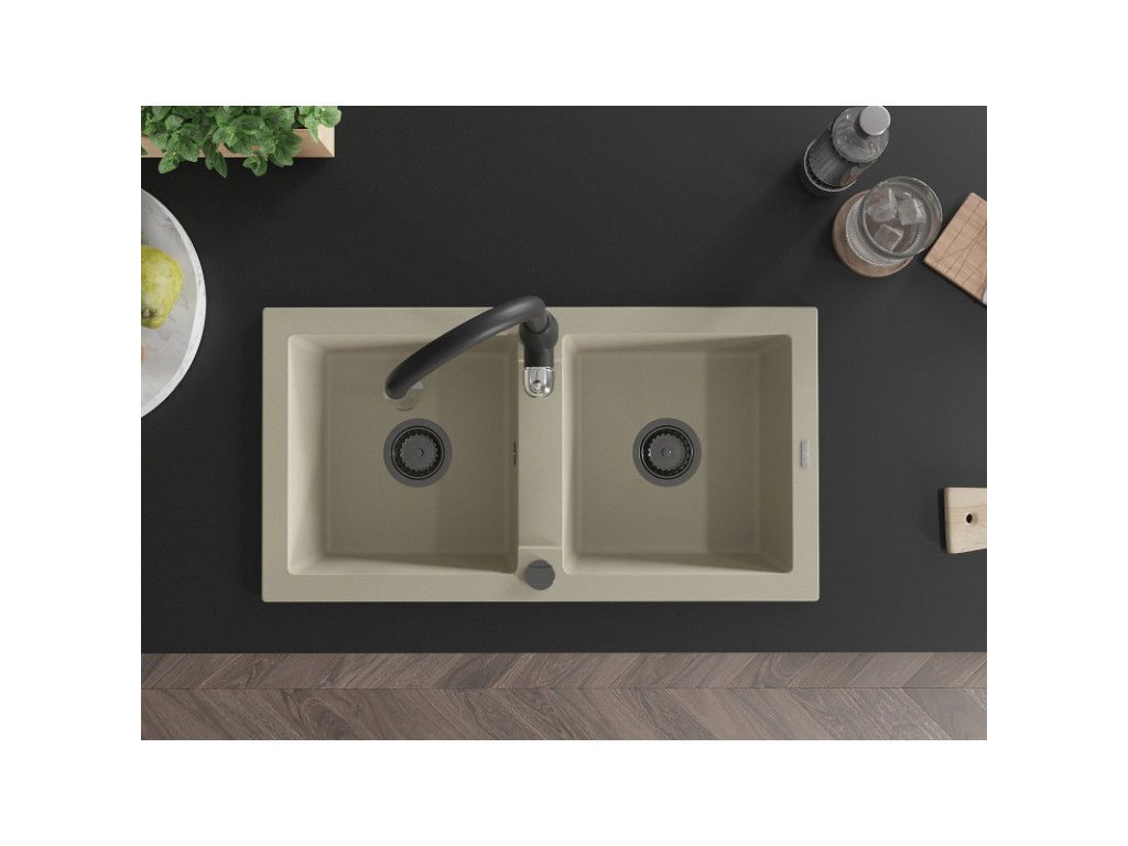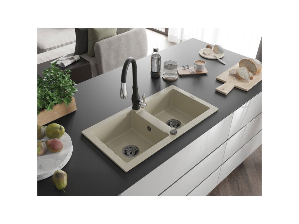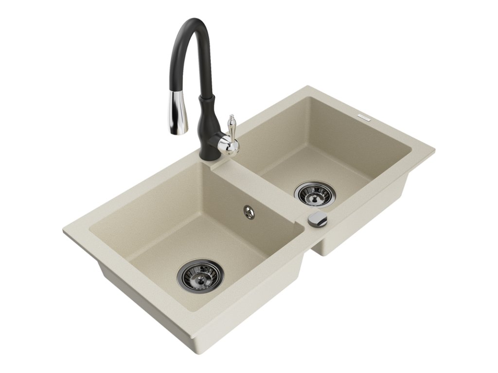 Granitový drez Mexen Mario s 2 miskami a kuchynskou batériou Savita, béžová - 6504-69-672601-70