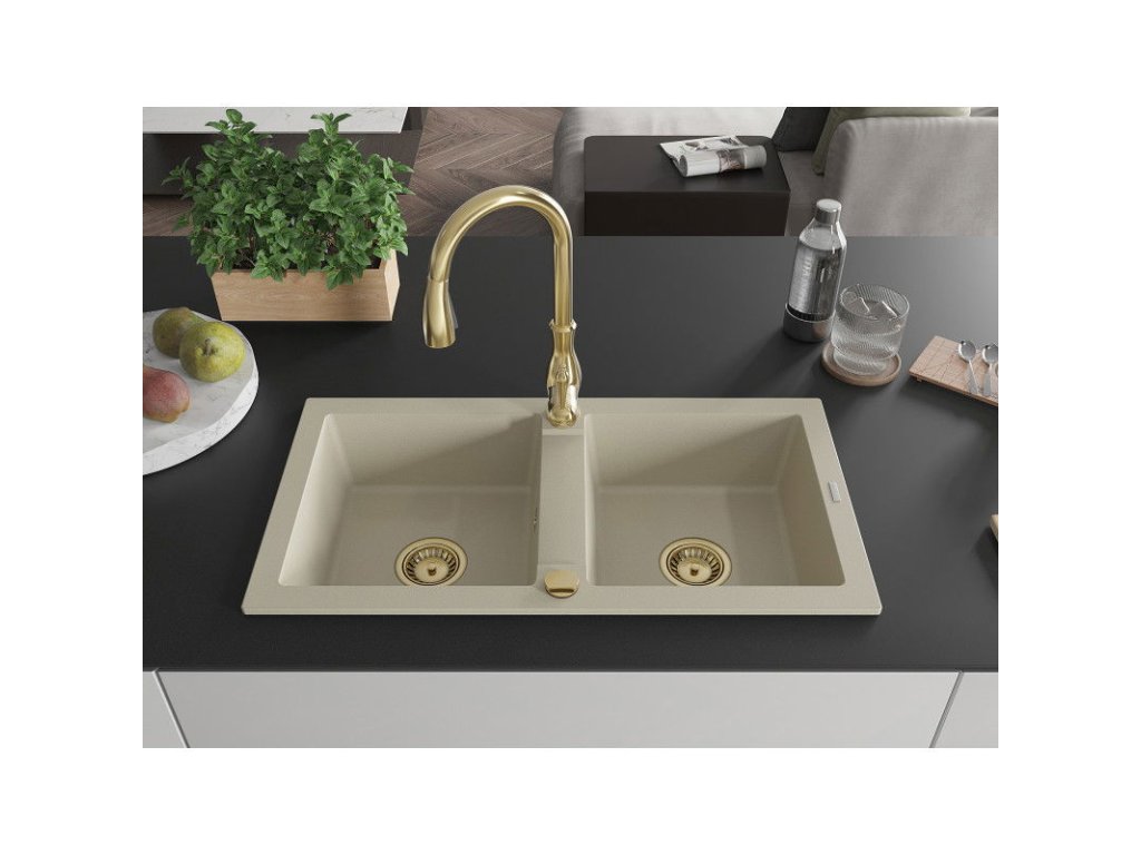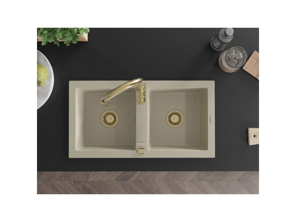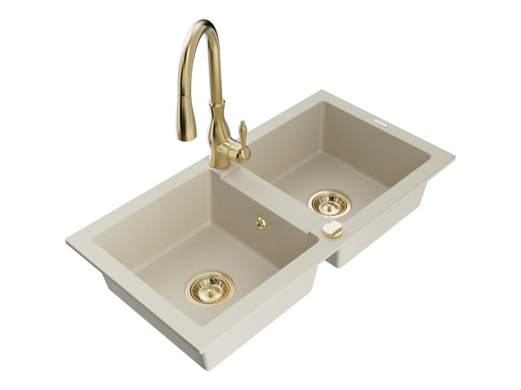 Granitový drez Mexen Mario s 2 miskami a kuchynskou batériou Savita, béžový - 6504-69-672601-50