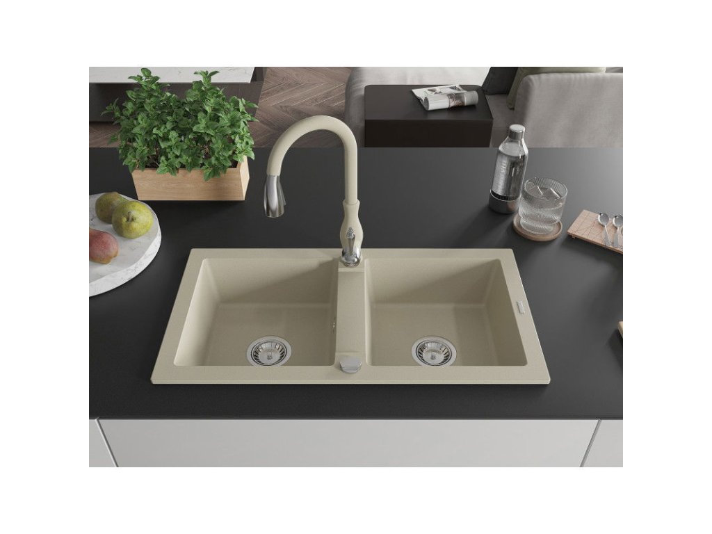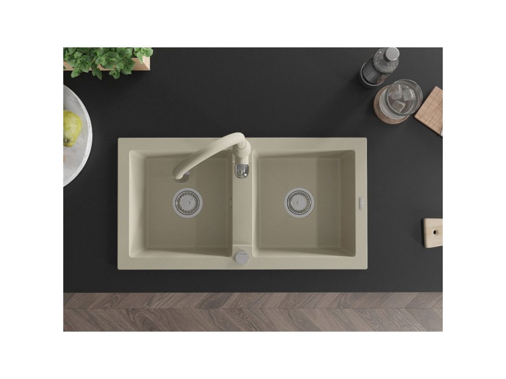 Granitový drez Mexen Mario s 2 miskami a kuchynskou batériou Savita, béžový - 6504-69-672601-69