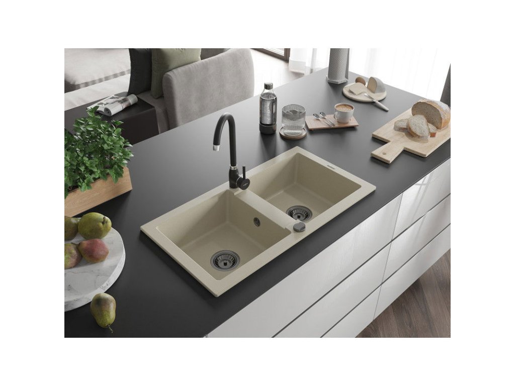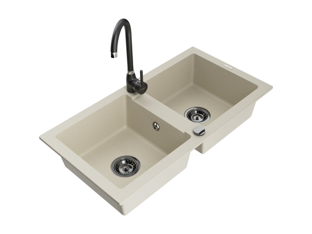 Granitový drez Mexen Mario s 2 miskami a kuchynskou batériou Telma, béžový - 6504-69-670200-70