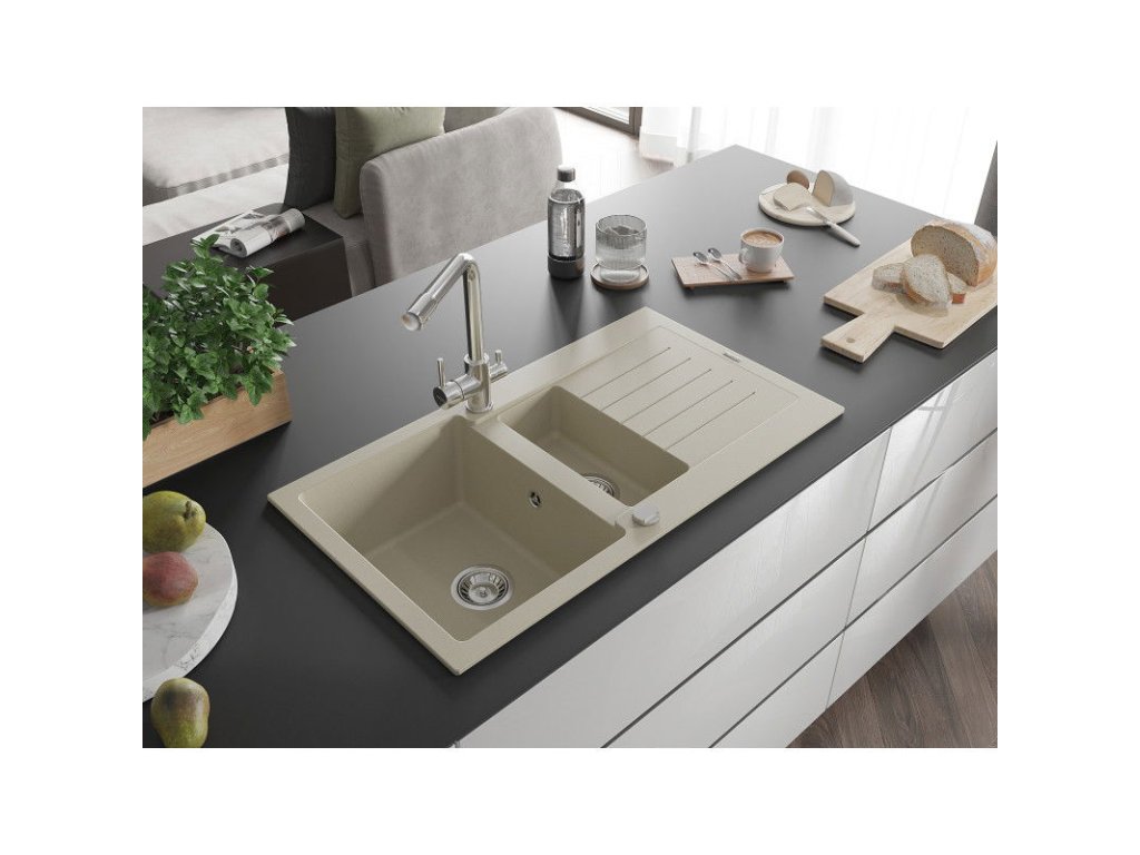 Granitový drez Mexen Matias s 1,5 miskou, odkapávačom a kuchynskou batériou Duero, béžový - 6502-69-671600-00