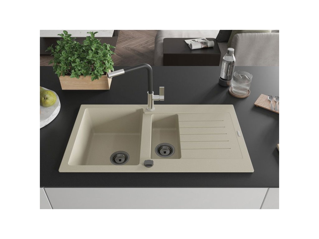 Granitový drez Mexen Matias s 1,5 miskou, odkapávačom a kuchynskou batériou Flora, béžový - 6502-69-670401-07-B