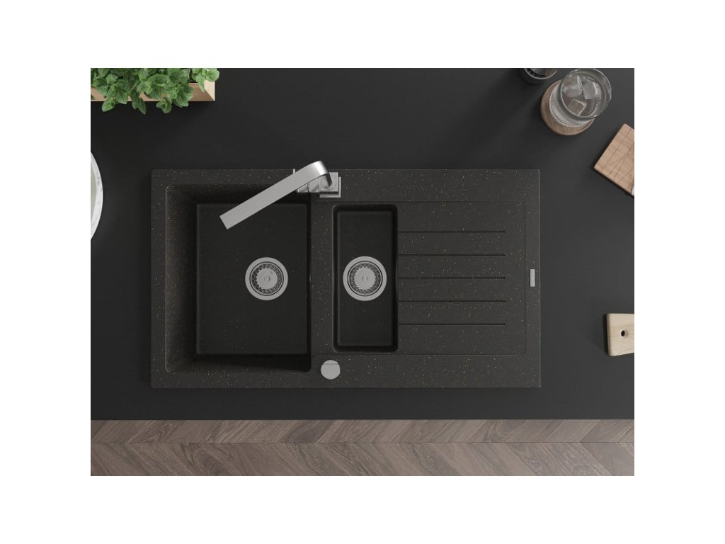 Granitový drez Mexen Matias s 1,5 miskou, odkapávačom a kuchynskou batériou Rita, čierna/zlatá - 6502-75-670300-00