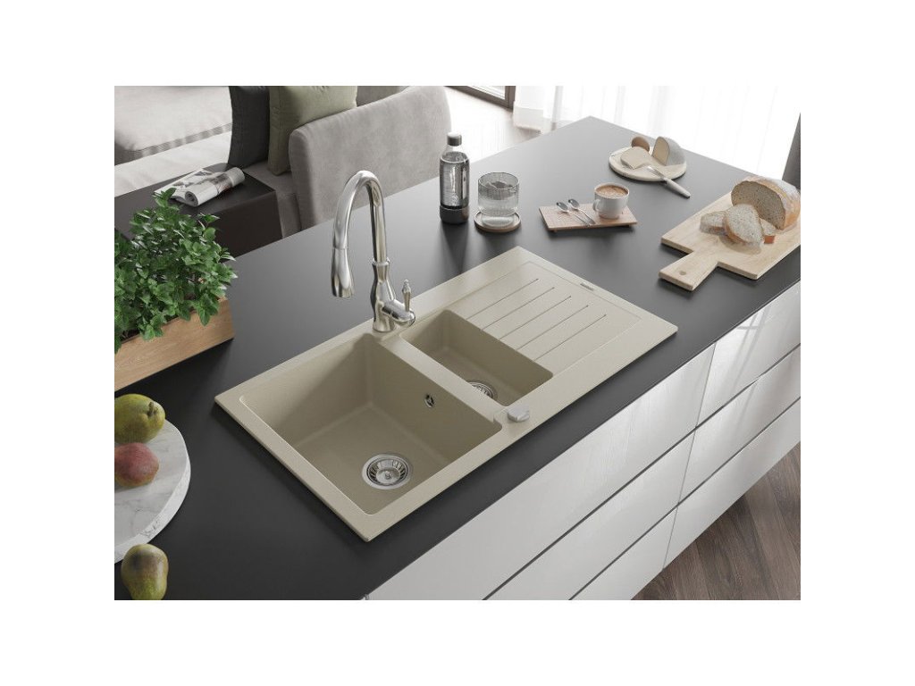 Granitový drez Mexen Matias s 1,5 miskou, odkapávačom a kuchynskou batériou Savita, béžový - 6502-69-672601-00