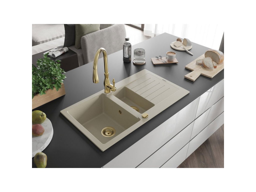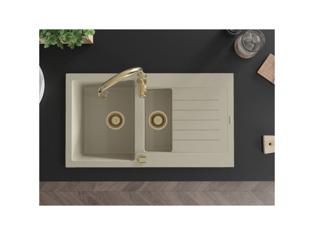 Granitový drez Mexen Matias s 1,5 miskou, odkapávačom a kuchynskou batériou Savita, béžový - 6502-69-672601-50