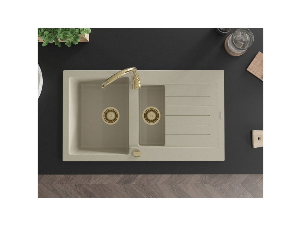 Granitový drez Mexen Matias s 1,5 miskou a odkapávačom 900 x 505 mm, béžový, zlatý sifón - 6502901505-69-G