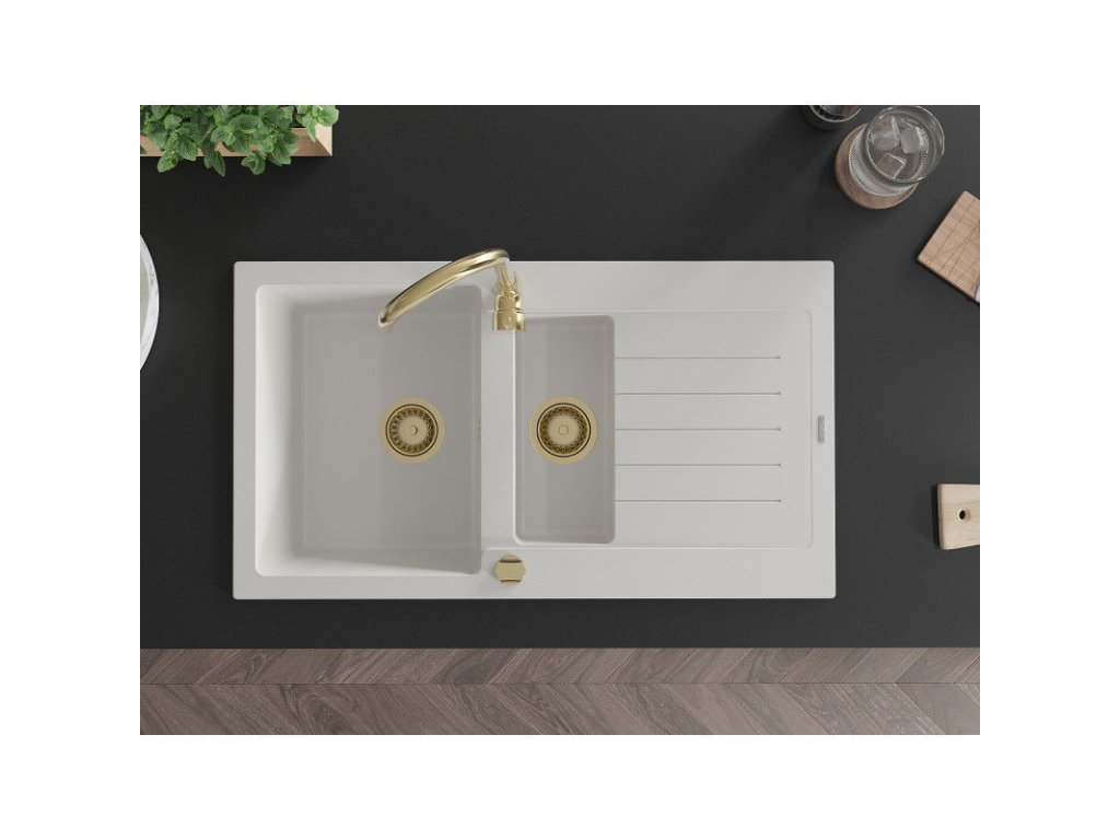 Granitový drez Mexen Matias s 1,5 miskou a odkapávačom 900 x 505 mm, biely, zlatý sifón - 6502901505-20-G