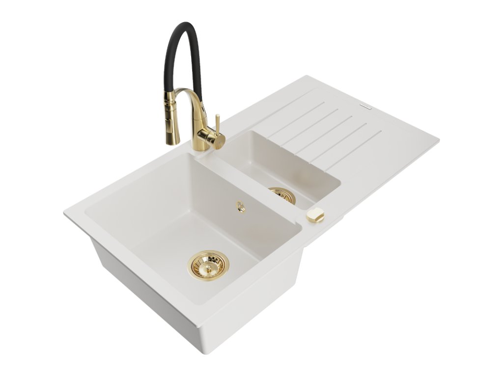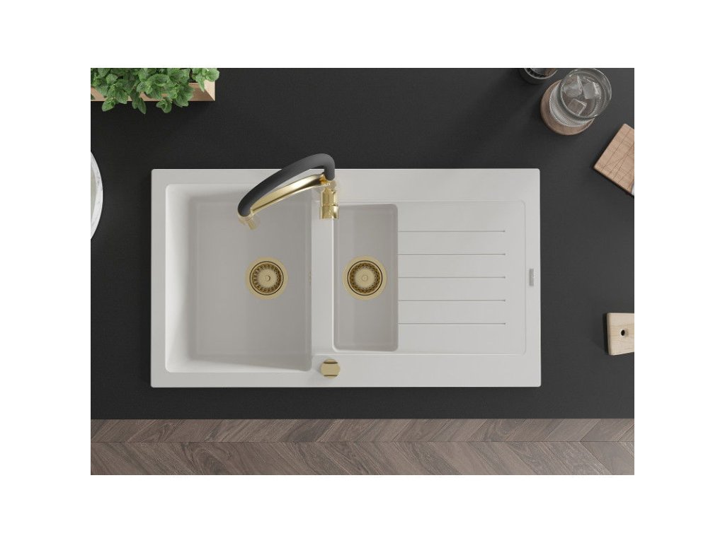 Granitový drez Mexen Matias s 1,5 misky, odkapávačom a batériou Aster, biely - 6502-20-73450-57-G